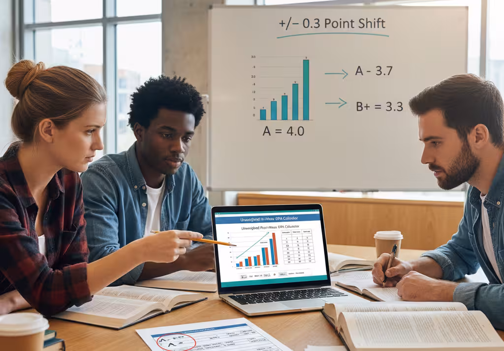 If your school uses plus/minus, small shifts matter. A grade can flip from A to A− from a tiny change. Use unweighted GPA plus minus calculator and check scale rules in types of GPA scales.