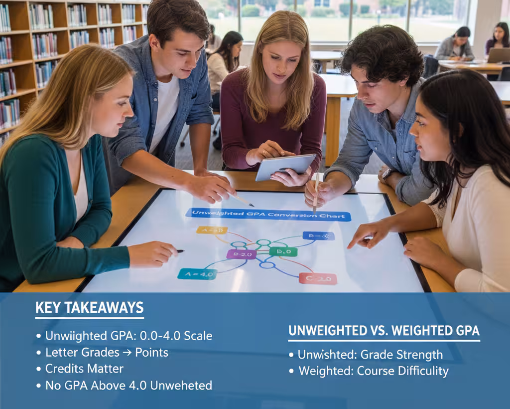 An Unweighted GPA Calculator (4.0 Scale) turns all your course grades into one number from 0.0 to 4.0. It treats every class the same, so class level does not add points. A in AP Calculus and A in regular English both count as 4.0. That makes unweighted GPA easy to compare across schools, even if they offer different honors options.